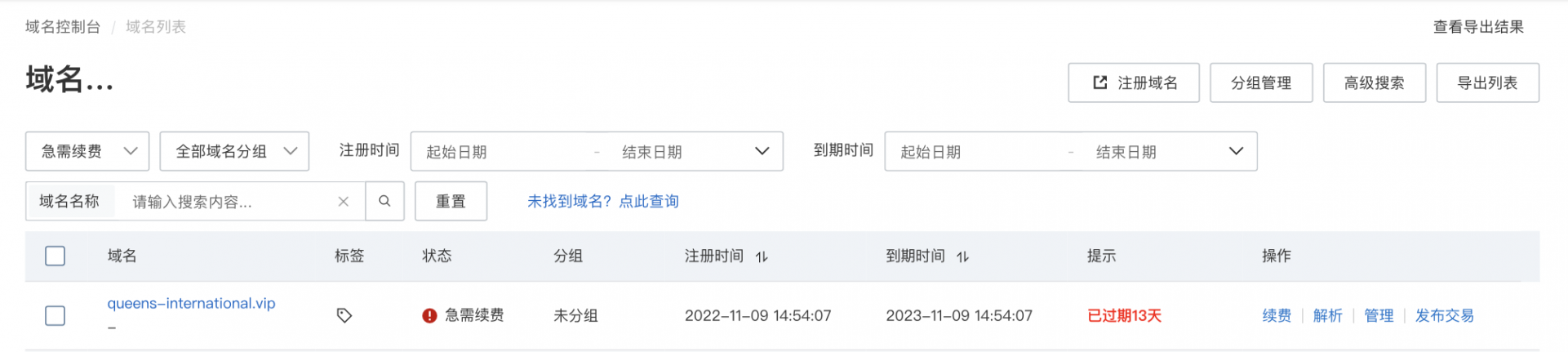 過期后域名解析被自動刪除,無法解析,過期超過1個月,則無法續(xù)費,只能高額贖回,如下圖: