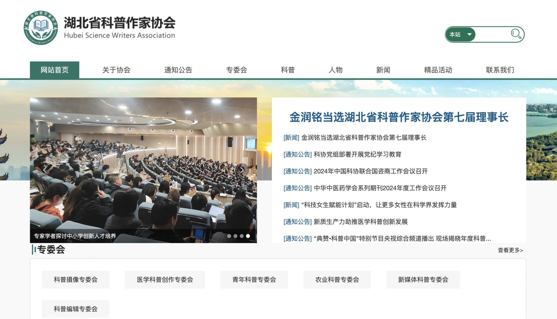 熱烈慶祝湖北省科普作家協(xié)會網(wǎng)站建設(shè)完成并上線!湖北省科普作家協(xié)會,1979年8月,在湖北省科學(xué)技術(shù)協(xié)會(省科協(xié))黨組的高度重視和支持下,湖北省科普作家協(xié)會(簡稱協(xié)會)正式成立,為促進(jìn)我省科普創(chuàng)作繁榮與發(fā)展、提高公眾科學(xué)文化素質(zhì)服務(wù)。