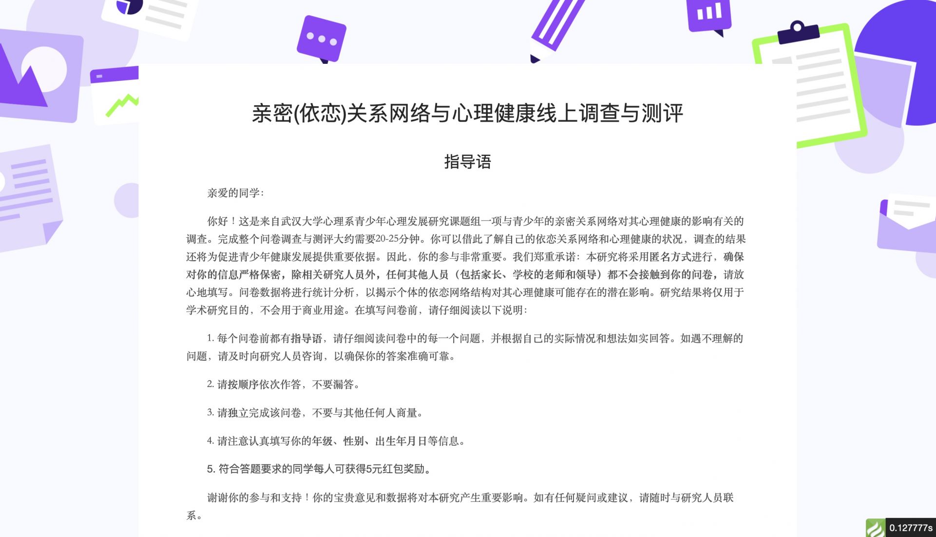 這是來自武漢大學(xué)心理系青少年心理發(fā)展研究課題組一項與青少年的親密關(guān)系網(wǎng)絡(luò)對其心理健康的影響有關(guān)的調(diào)查。完成整個問卷調(diào)查與測評大約需要20-25分鐘。你可以借此了解自己的依戀關(guān)系網(wǎng)絡(luò)和心理健康的狀況,調(diào)查的結(jié)果還將為促進青少年健康發(fā)展提供重要依據(jù)。因此,你的參與非常重要。我們鄭重承諾:本研究將采用匿名方式進行,確保對你的信息嚴格保密,除相關(guān)研究人員外,任何其他人員(包括家長、學(xué)校的老師和領(lǐng)導(dǎo))都不會接觸到你的問卷,請放心地填寫。問卷數(shù)據(jù)將進行統(tǒng)計分析,以揭示個體的依戀網(wǎng)絡(luò)結(jié)構(gòu)對其心理健康可能存在的潛在影響。研究結(jié)果將僅用于學(xué)術(shù)研究目的,不會用于商業(yè)用途。
