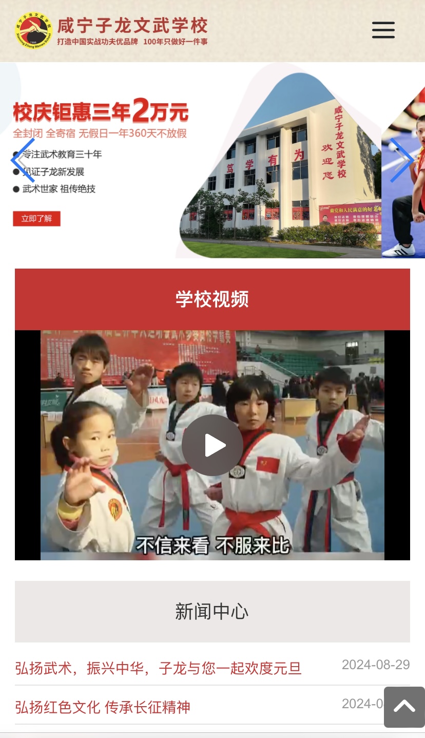 熱烈慶祝咸寧子龍文武學(xué)校網(wǎng)站建設(shè)完成并上線!咸寧子龍文武學(xué)校坐落于美麗的青龍山腳下,學(xué)校創(chuàng)辦于1996年,是一所文武兼修以小學(xué)、初中、高中、中專為一體的全寄宿式學(xué)校!學(xué)校實行軍事化、全封閉式管理模式。一年360天不放假。學(xué)校擁有以碩博為主的高級管理人員10名,經(jīng)驗豐富的文化教師30名,國家一級教練員18名,目前在冊學(xué)生1500余人。