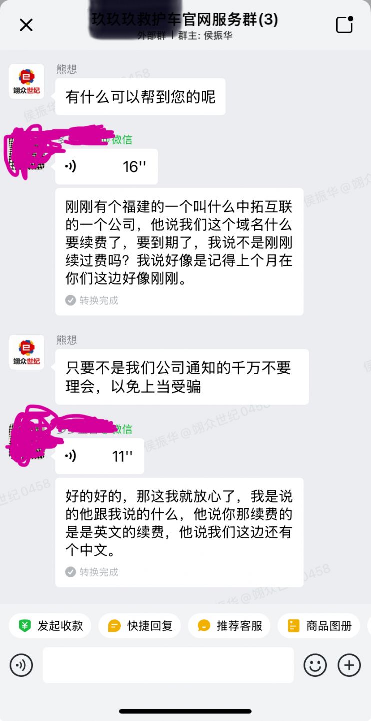 近期有有不少客戶反饋接到自稱域名到期要求續(xù)費的通知。對方有模有樣的出局了加蓋公章的域名續(xù)費通知函、綁定已經(jīng)注冊的真實域名、加蓋公章的合同。不要上當(dāng)受騙,他們實際是出售中文域名,將中文域名綁定到您已經(jīng)注冊的英文域名,中文域名沒有任何價值,不要上當(dāng)受騙,一旦上當(dāng)受騙我們也無能為力,因為您們簽署了真實有效的合同。我們不會突然通知到期續(xù)費,都是在到期前一個月就開始通知。不是我們公司人員通知續(xù)費請不要搭理,以免上當(dāng)受騙。請知悉并相互轉(zhuǎn)告。