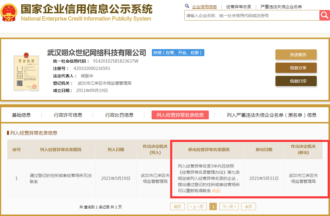 我司于2021年5月19日被錯誤操作為”異常經(jīng)營“,原因為”查無此址“或”無法聯(lián)系“,實際上我司一直在注冊地正常辦公,我司第一時間撥打12345投訴,以維護我司正常權益,相關單位第二天來我司核實,核實無誤后已提交資料,5月31日移除”異常經(jīng)營“,現(xiàn)已恢復正常。